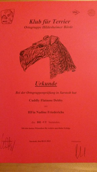 Debby hat mit ihrem Frauchen die Begleithundeprüfung mit Verhaltenstest bestanden. Dazu muss gesagt werden, dass Nadine mit Debby ihren ersten eigenen Hund hat und mit Einzug von Debby den in Niedersachsen vorgeschriebenen Hundeführerschein absolvieren musste. Wir finden es eine enorme Leistung, mit seinem ersten Hund gemeinsam die BH zu erarbeiten und gratulieren Nadine und Debby von ganzen Herzen.