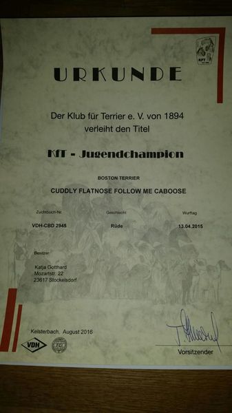 In diesem Jahr fand die weltgrößte Hundeausstellung in Deutschland / Leipzig statt. Es waren dort 206 Boston Terrier gemeldet. Und wir sind auch etwas stolz :-) Nachdem im letzten Jahr eine Tochter von unserem Cuddly Flatnose Barky Junior World Winnerin geworden ist, hat dieses Jahr ein Enkelsohn von Cuddly Flatnose Brenda den Titel World Junior Winner 2017 errungen und wurde sogar noch bester Junghund. Wir freuen uns sehr, auch wenn wir nicht viel dazu beigetragen haben. Herzlichen Glückwunsch an die Besitzer und Züchter der Junior World Winner :-)